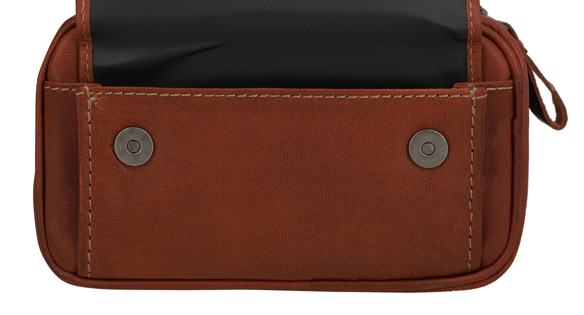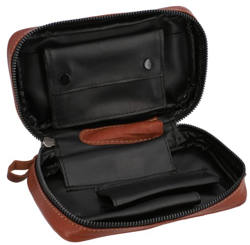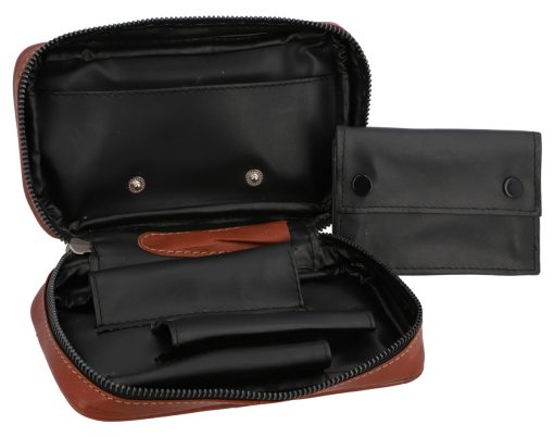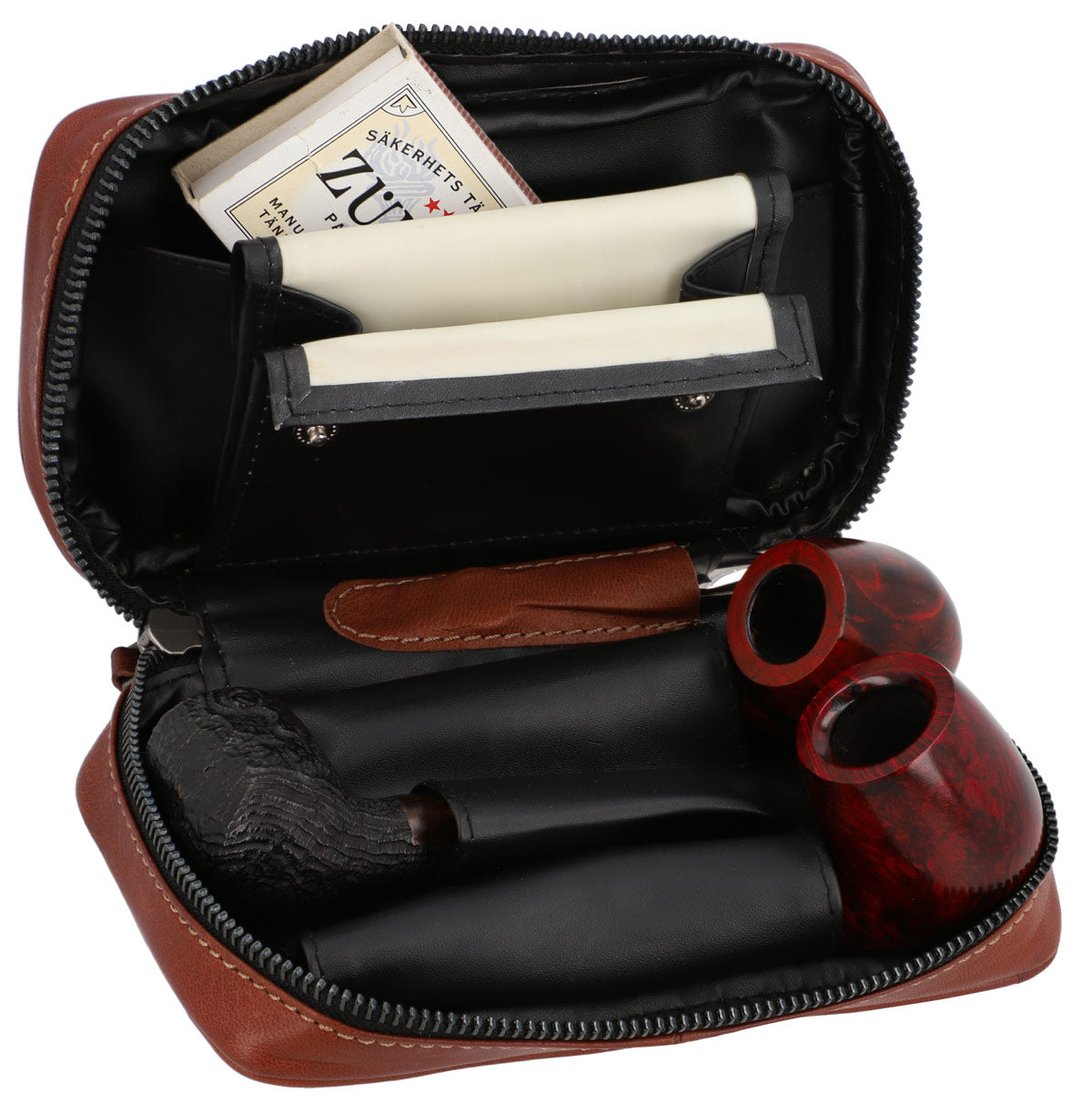 Das Innere von „Diego“ ist ebenso funktional wie ansprechend aufgemacht wie sein Äußeres: so finden in den integrierten Steckfächern drei Pfeifen ihren Platz, während ein zusätzliches Täschchen es Dir ermöglicht, Deinen Lieblingstabak in Griffweite und sicher zu verwahren, ohne dass Du befürchten musst, dass sich der Tabak im gesamten Etui verteilt. Der Innenraum dieser kleinen Tasche ist mit Naturkautschuk ausgekleidet, sodass der Tabak auch problemlos lose darin gelagert werden kann. Ein weiteres kleines Steckfach schafft Platz für Stopfwerzeug und das zusätzliche Außenfach sowie das rückseitige Reißverschlussfach bieten Unterbringungsmöglichkeiten für Streichhölzer, Pfeifenreiniger und all das Equipment, dass Du für’s stil- und genussvolle Pfeiferauchen eben benötigst. Ein umlaufender Reißverschluss verschließt „Diego“ derweil sicher sorgt so dafür, dass auch unterwegs nichts einfach aus dem Etui herausfallen kann.