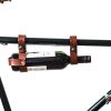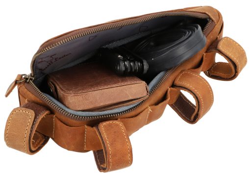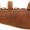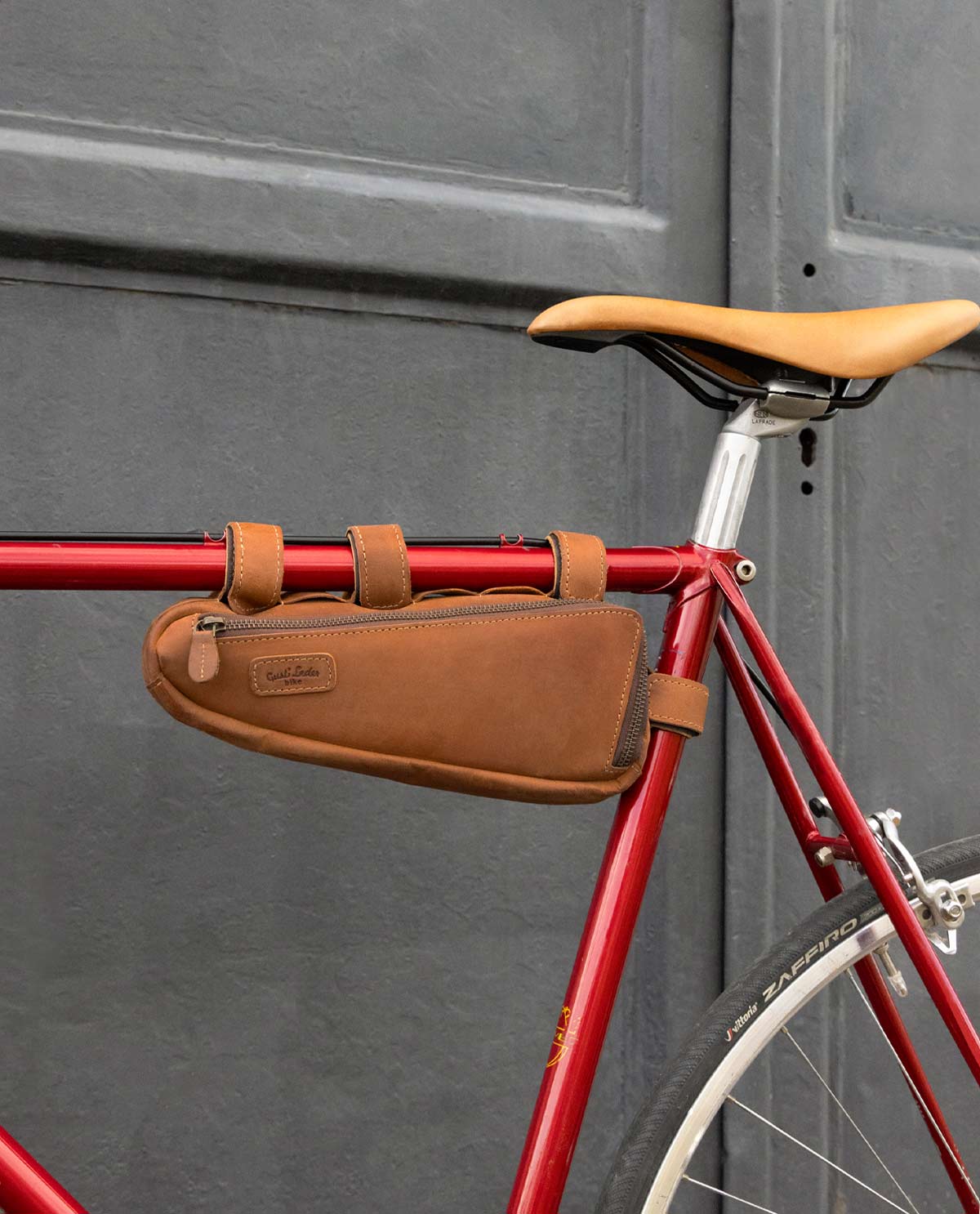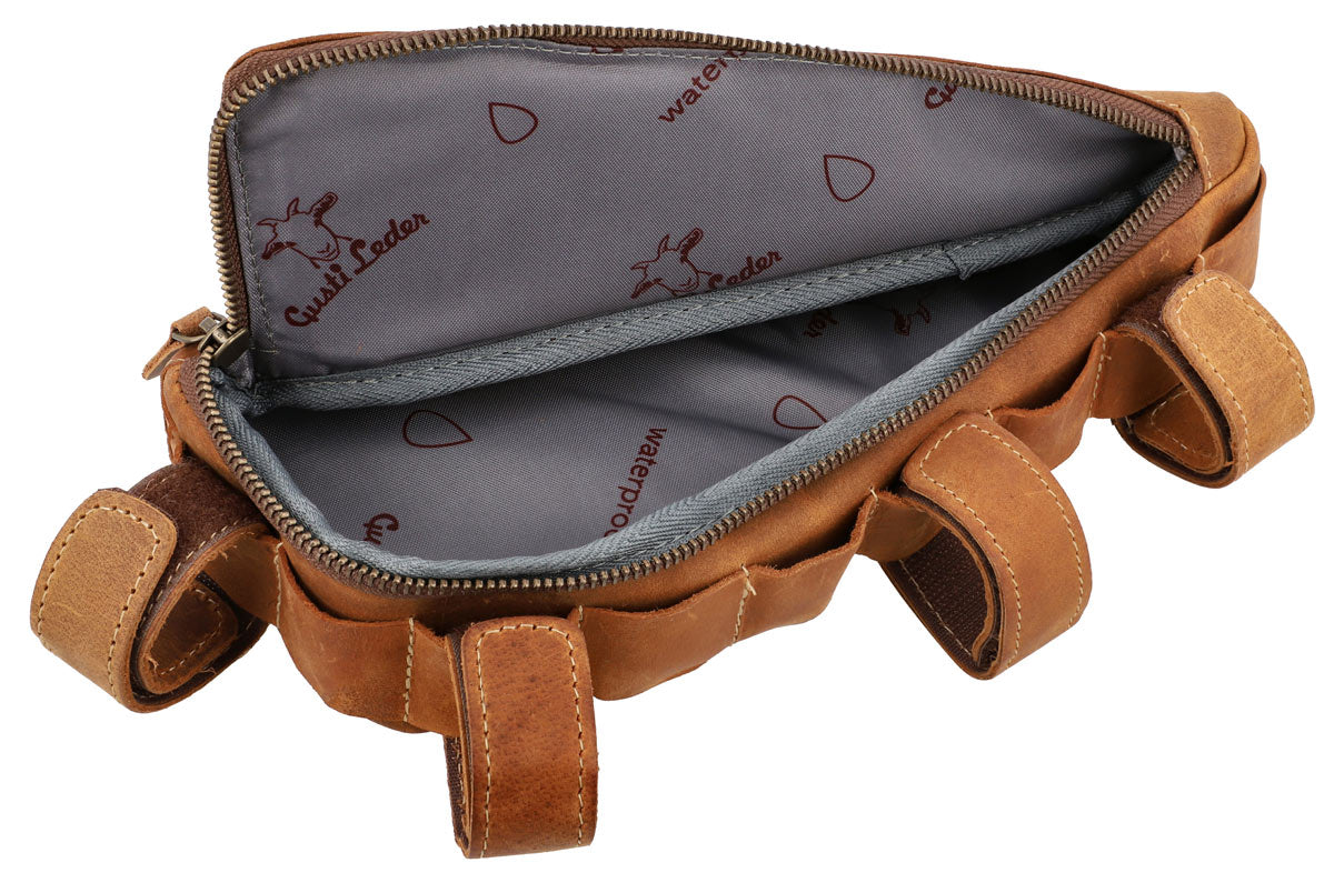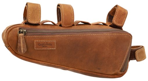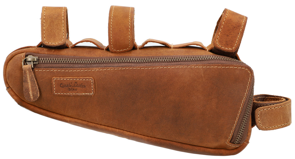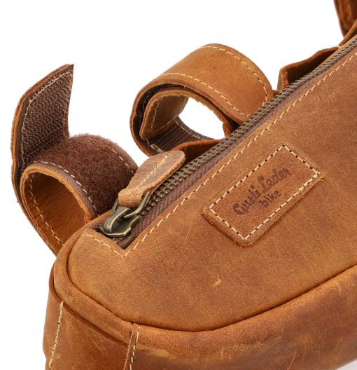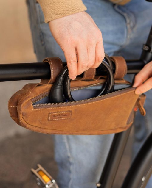 „Maurice G.“ überzeugt nicht nur mit seinem wasserabweisenden & abwischbaren Polycotton-Innenfutter, sondern auch mit seiner sicheren Befestigung. Dank vier stabilen Lederriemen sitzt die Tasche fest am Rahmen. Zusätzlich sorgen Lederriemen mit Klettverschluss für eine zuverlässige Fixierung um die Querstange, sodass die Tasche auch auf unebenen Wegen sicher an Ort und Stelle bleibt. Sie bietet ausreichend Platz für Werkzeug, Schloss, Regencape & weitere Essentials. Die stabilen Reißverschlüsse an beiden Seiten gewährleisten, dass nichts herausfällt – selbst auf holprigen Strecken.