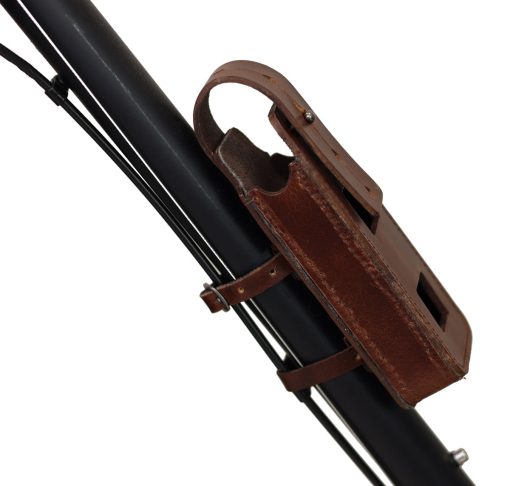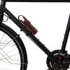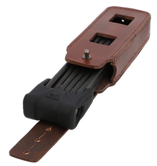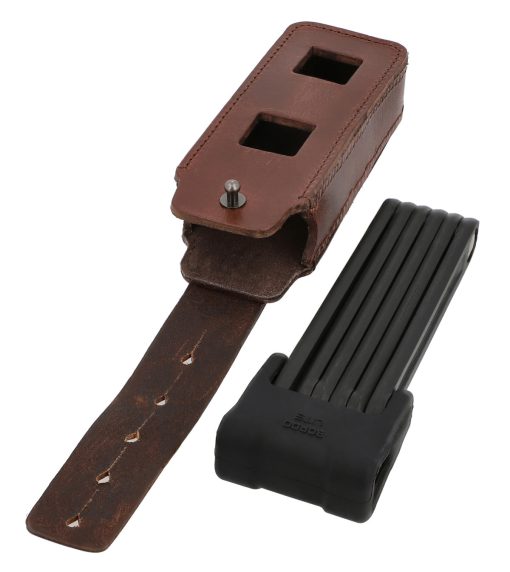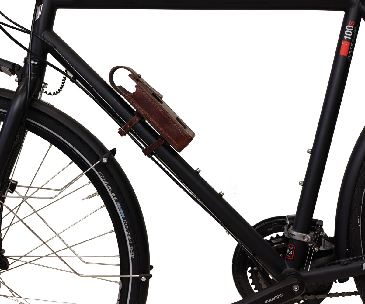 Die hochwertige Büffellederhülle lässt sich in der Größe anpassen, damit Dein Schloss perfekt sitzt. Die Verschlussklappe bietet mehrere Einstellmöglichkeiten, sodass Du die ideale Passform wählen kannst. Zur Befestigung stehen Dir zwei Optionen offen: Entweder verschraubst Du sie an der Vorbohrung für den Flaschenhalter oder fixierst sie flexibel mit den beiden 19 cm langen, mitgelieferten Riemen am Rahmen fest.