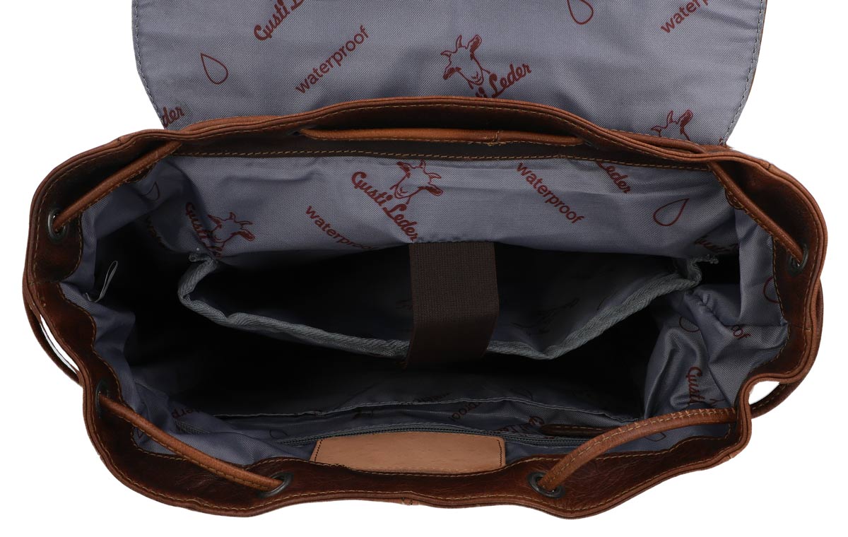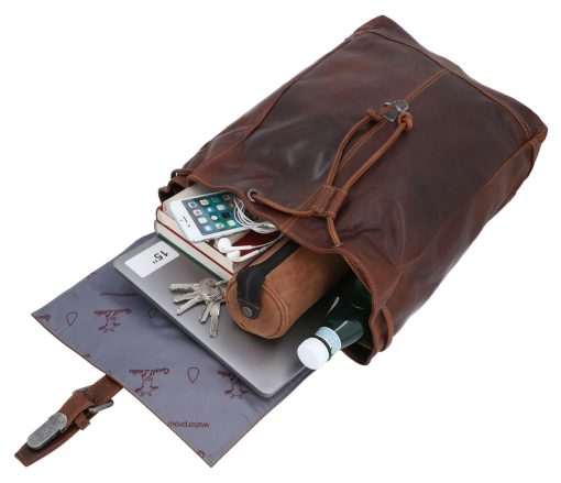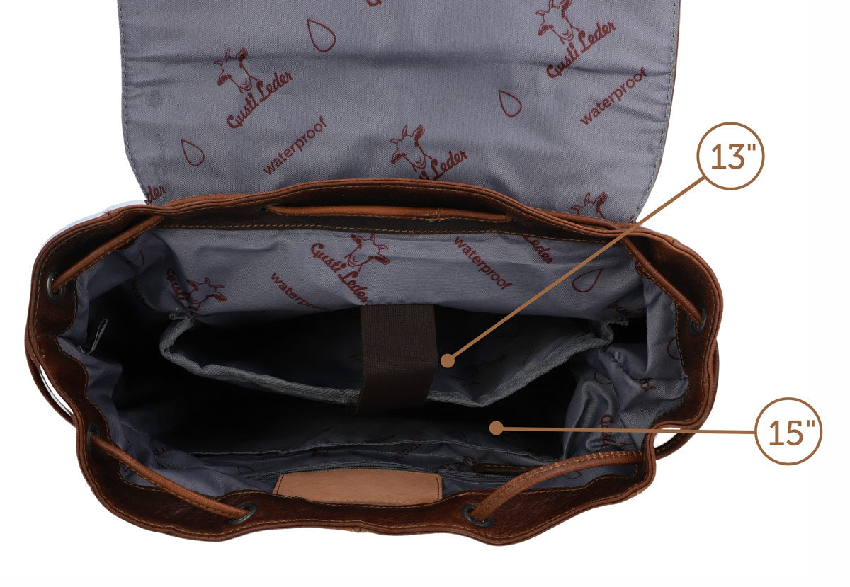 Praktisch, kompakt und ohne viel Schnick-Schnack bietet das Hauptfach von „Jaime“ Dir nämlich mehr als genügend Stauraum für Dein 15“-Notebook – hierfür hast Du sogar ein separates Fach mit einem ergänzenden Klettverschluss –, diverse DIN A4-Hefter, eine große Trinkflasche, Proviant usw. Die gepolsterte Rückenpartie von „Jaime“ ist farblich auf das Leder des Rucksacks abgestimmt und bietet Dir ebenso wie die längenverstellbaren Schulterriemen eine Extraportion Tragekomfort.