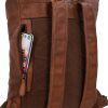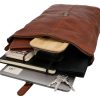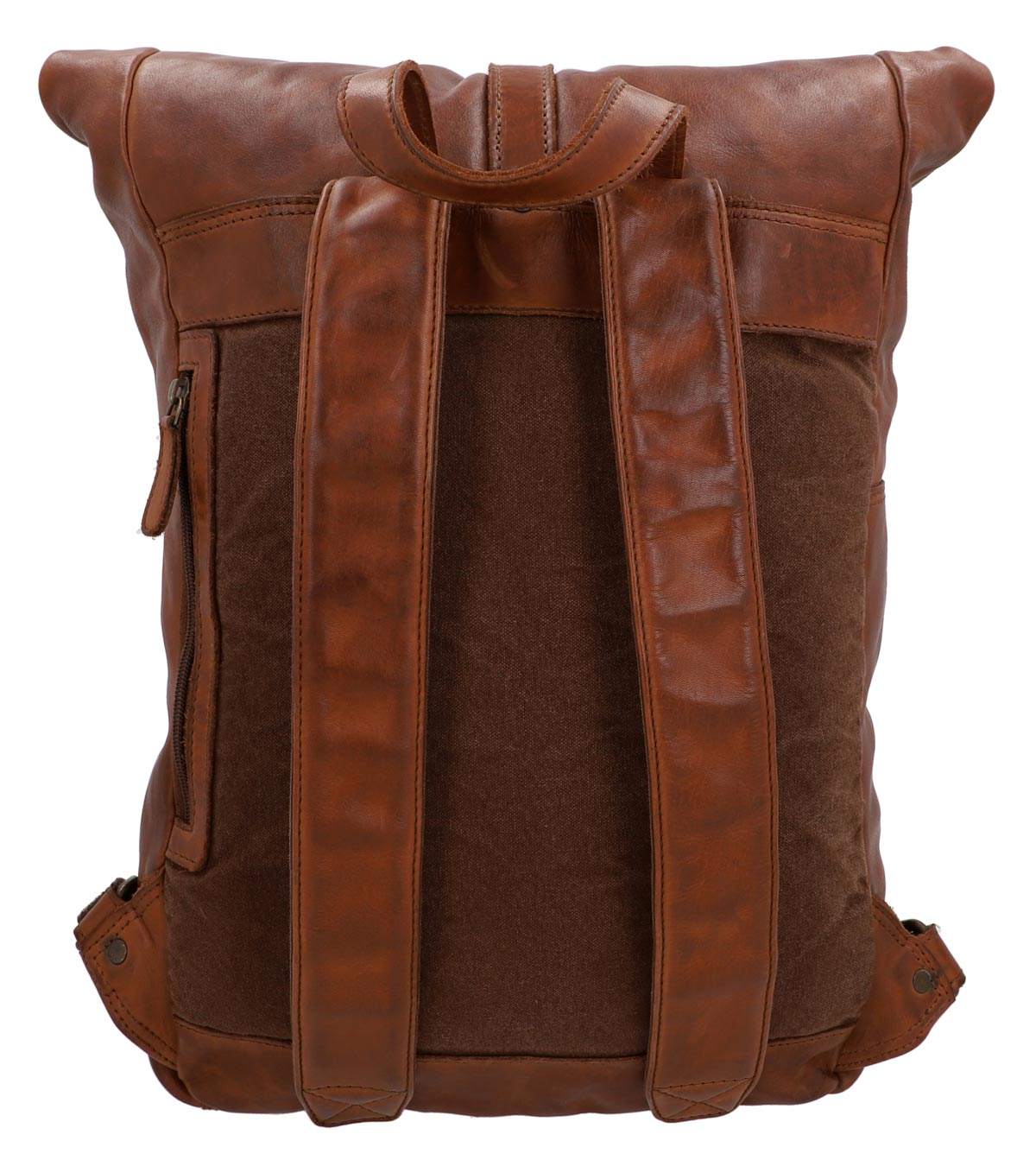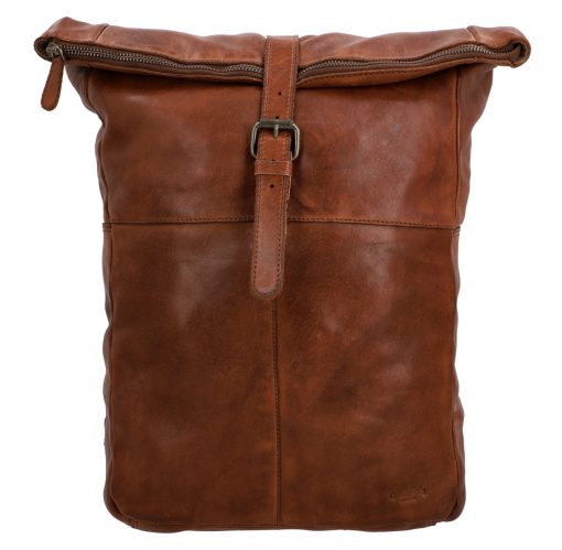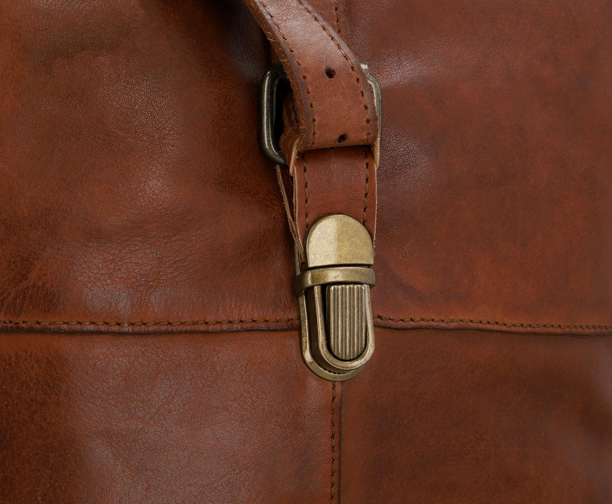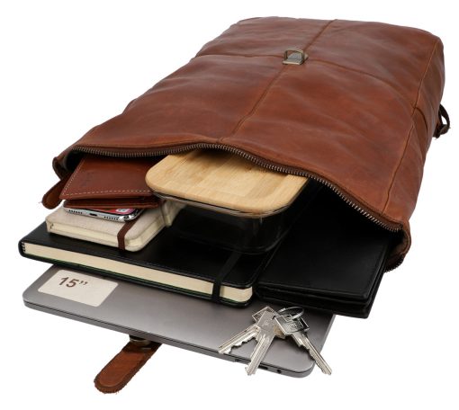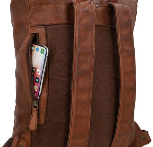 „Henning“ ist ein mittelgroßer Rolltop-Rucksack aus widerstandsfähigem Rindsleder, der durch seinen schmalen Schnitt geradezu dafür gemacht ist, um im Großstadtgewirr oder der Enge der S-Bahn zur Rush Hour abzuliefern. Durch seine durchdachte Aufteilung bietet er Dir nämlich ausreichend Raum, um ohne Weiteres Deine DIN A4-Unterlagen, das 15″-Notebook, eine ganze Hand voll Bücher und eine große Trinkflasche im geräumigen Hauptfach zu verstauen, während Dir ein zusätzliches Steckfach sowie ein Reißverschluss-Innenfach dabei helden, Deine Habe mit System zu strukturieren, sodass alles seinen festen Platz findet. Und sollte doch mal etwas auslaufen, schützt der helle Innenstoff aus wasserfestem Polycotton das Leder Deines Rucksacks vor Nässe oder gar vor Fleckenbildung. Das seitliche Reißverschlussfach außen bietet Dir derweil Platz für all die Dinge, die Du immer mal wieder zwischendurch benötigst, während die gepolsterte Rückenpartie wie auch die Innenseite der breiten Schulterriemen mit braunem Canvas bespannt sind und Dir so eine Extraportion Tragekomfort bieten.