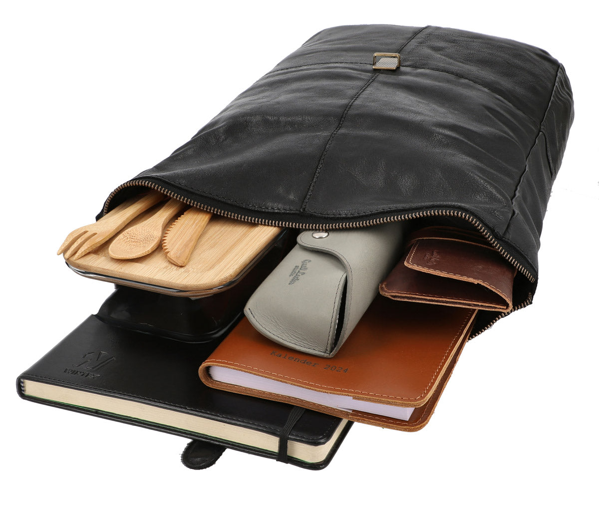 „Henning“ ist ein mittelgroßer Rolltop-Rucksack aus widerstandsfähigem Rindsleder, der durch seinen schmalen Schnitt geradezu dafür gemacht ist, um im Großstadtgewirr oder der Enge der S-Bahn zur Rush Hour abzuliefern. Durch seine durchdachte Aufteilung bietet er Dir nämlich ausreichend Raum, um ohne Weiteres Deine DIN A4-Unterlagen, das 15″-Notebook, eine ganze Hand voll Bücher und eine große Trinkflasche im geräumigen Hauptfach zu verstauen, während Dir ein zusätzliches Steckfach sowie ein Reißverschluss-Innenfach dabei helfen, Deine Habe mit System zu strukturieren, sodass alles seinen festen Platz findet.