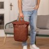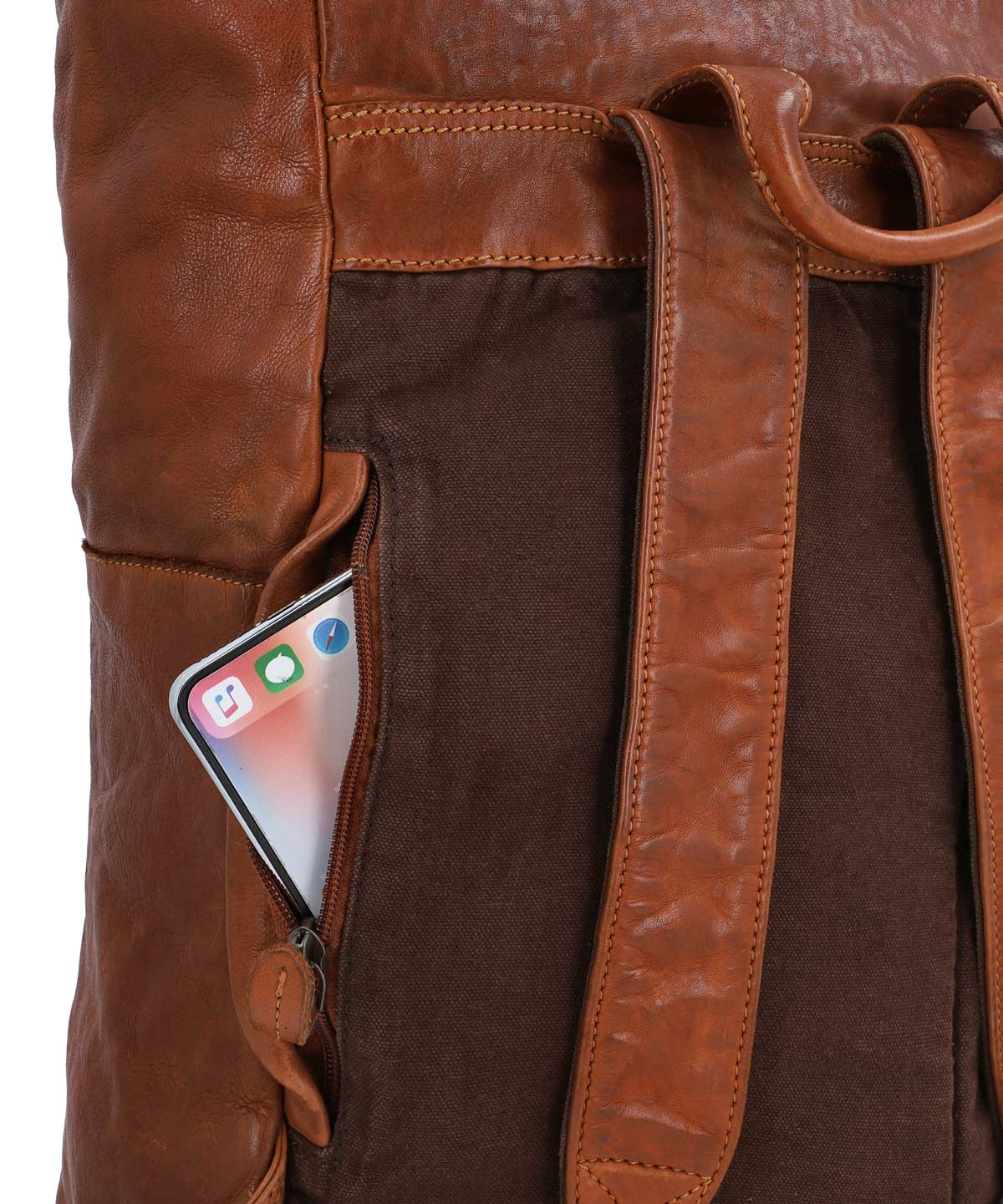 „Joy“ besticht jedoch nicht nur durch den Look, sondern auch durch den Stauraum, den der Rucksack Dir bietet. Im wirklich geräumigen Innenfach mit dem zusätzlichen Steck- und Reißverschlussfach finden so ohne Weiteres Deine DIN A4-Unterlagen Platz, genau wie Dein 15″-Notebook, eine ganze Hand voll Bücher und eine große Trinkflasche. Der Verschlussmechanismus des Hauptfachs – ein weiter Reißverschluss – schützt Deine Habseligkeiten derweil optimal vor eindringender Feuchtigkeit und Staub und ermöglicht Dir zugleich einen umfassenden Überblick über den Inhalt Deines Rucksacks. Die gepolsterte Rückenpartie von „Joy“ ist mit braunem Canvas bespannt und bietet Dir so eine Extraportion Tragekomfort. Das seitliche Reißverschlussfach außen bietet derweil Platz für Dinge, die Du immer wieder zwischendurch benötigst: Taschentücher, Kaugummis, Handdesinfektion usw., während Du im Fach unterhalb der Schulterriemen ein Regencover für „Joy“ verstauen kannst.