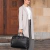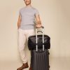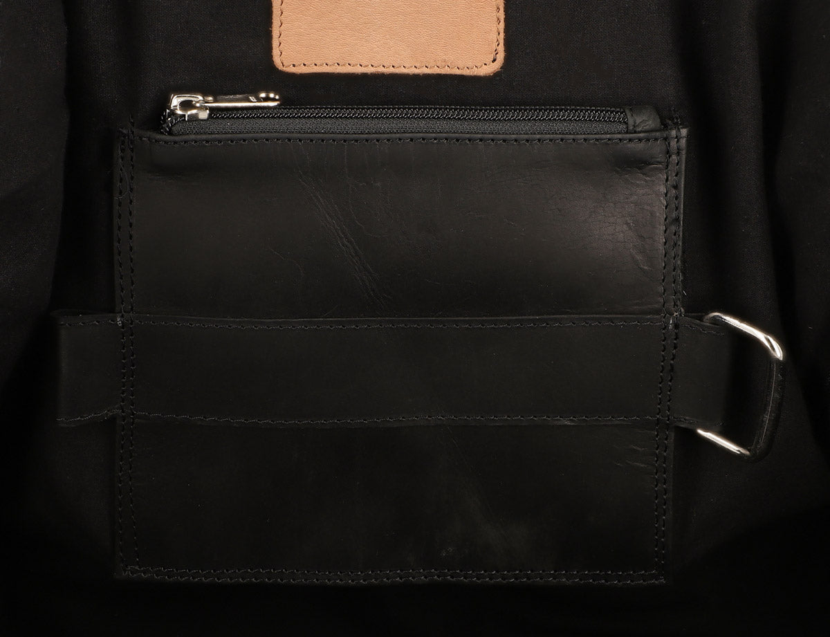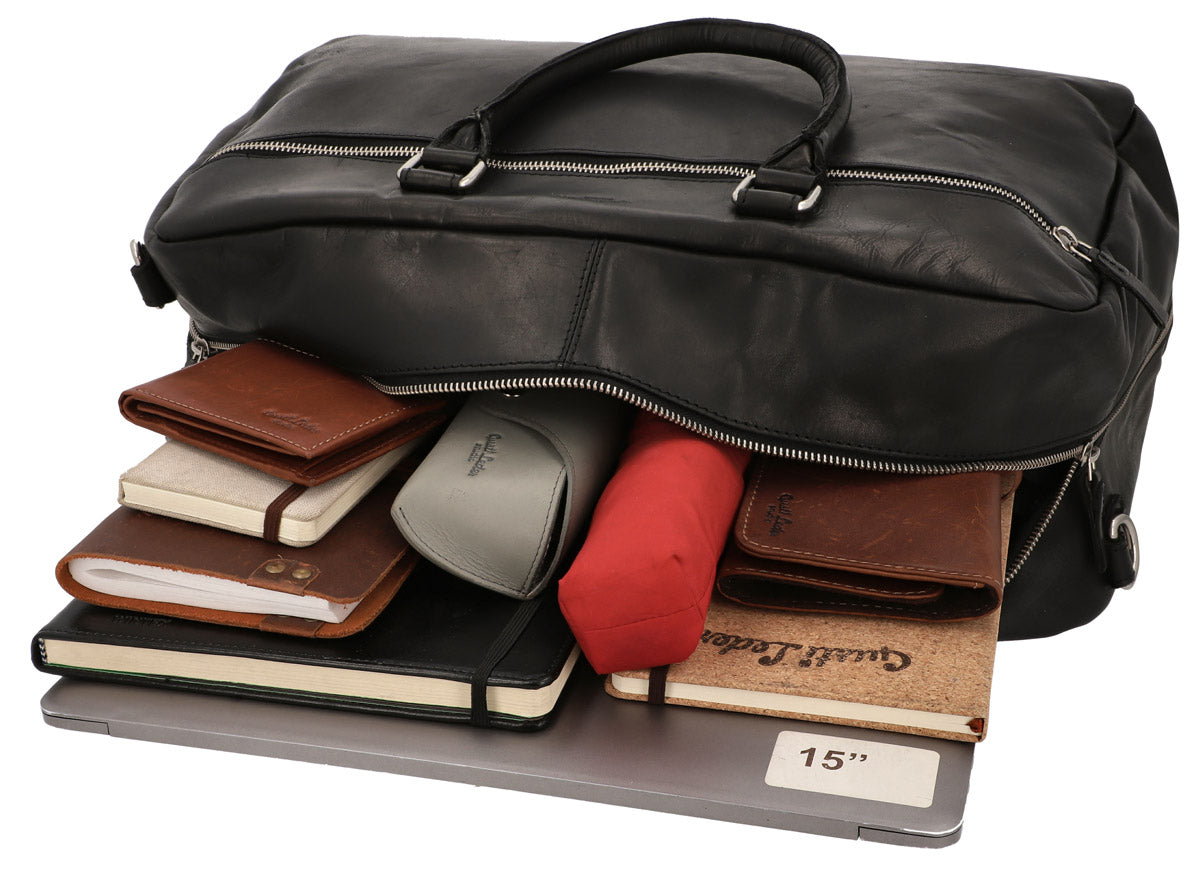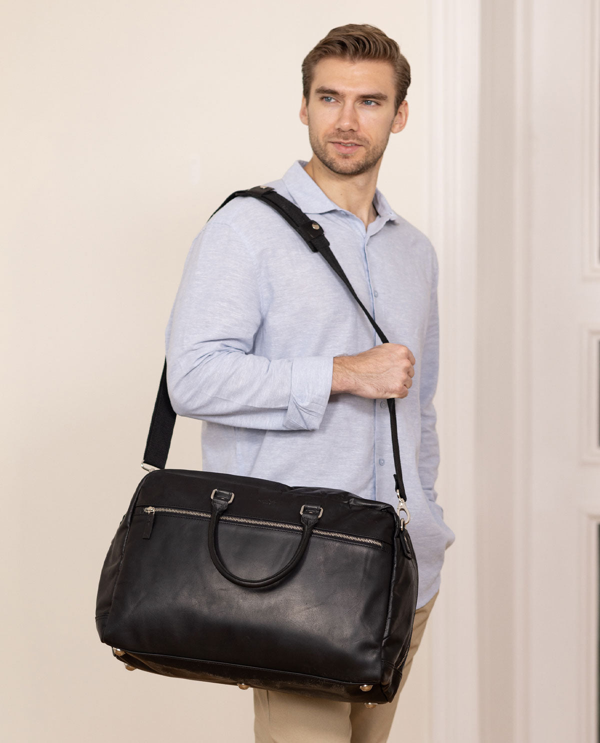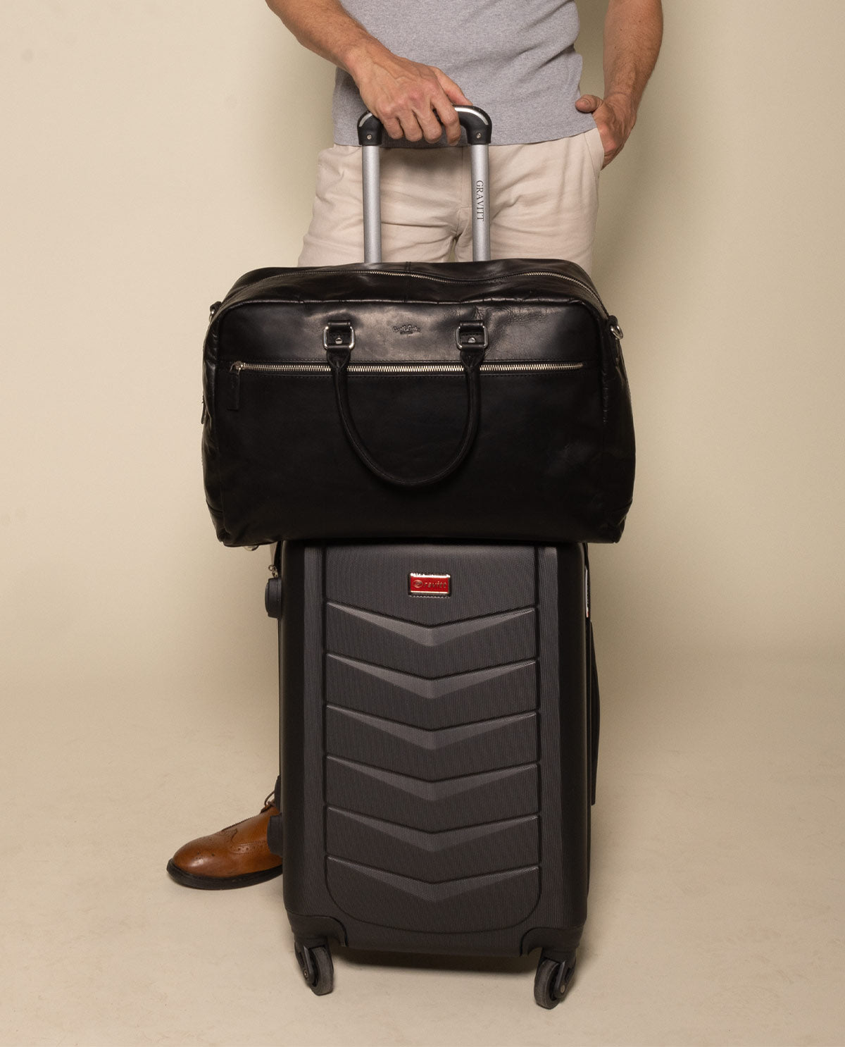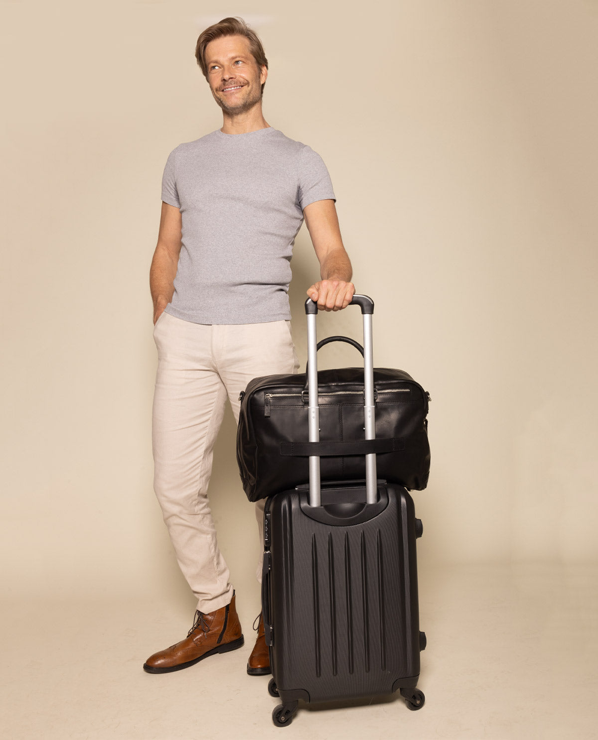 Unsere Ledertasche hat auch eine praktische Trolley-Schlaufe, damit du sie ganz einfach an deinem Rollkoffer befestigen kannst.