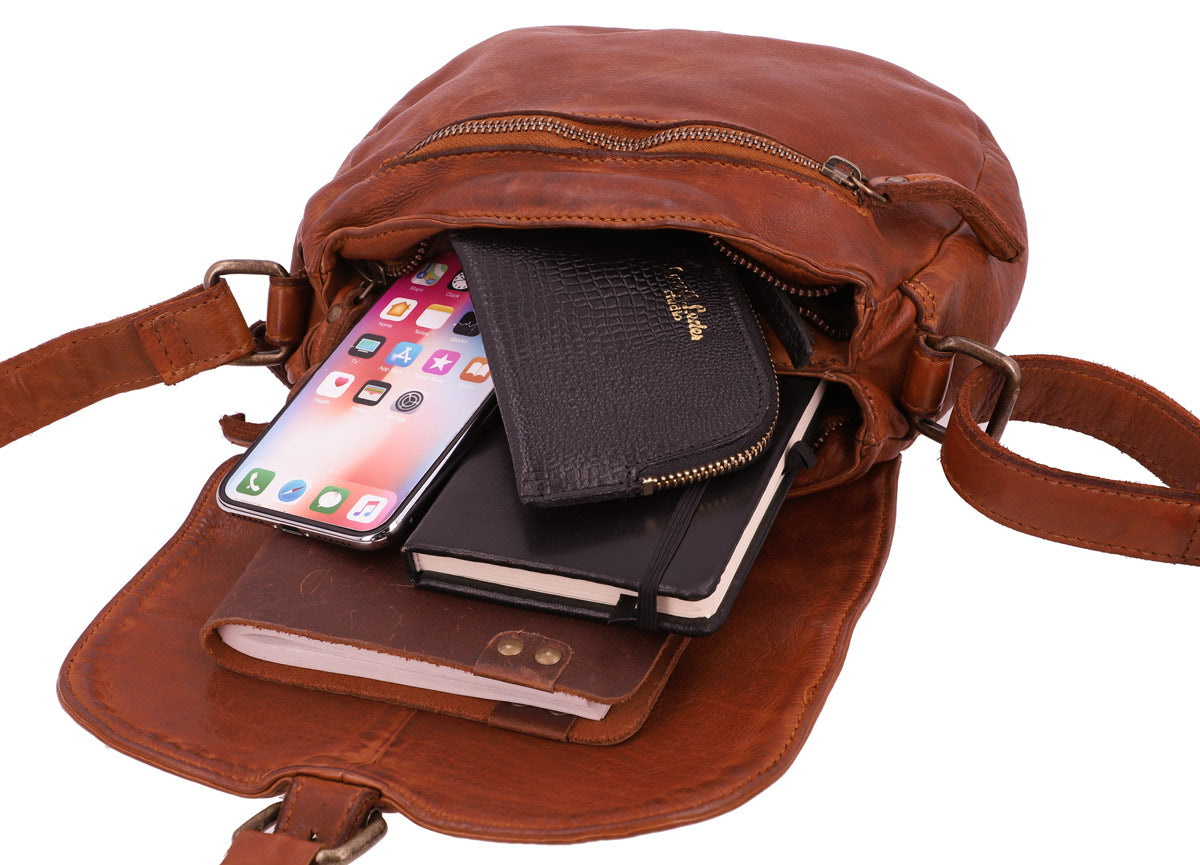 Die kompakte Form erlaubt Dir, agil unterwegs zu sein und dennoch alles Wichtige bei Dir zu tragen. In den zwei Hauptfächern findest Du bequem Platz für Geldbörse, Schlüssel, Handy und Make-up. Ein zusätzliches Reißverschlussfach vorne bietet schnellen Zugriff auf wichtige Kleinigkeiten wie Kopfhörer. Die Hauptfächer schließen sicher mit Reißverschluss, ergänzt durch einen Dornschnallenverschluss, der das Magnetschloss ziert. Das hochwertig verarbeitete Rindsleder rundet das Design von „Stefanie“ stilvoll ab.