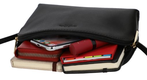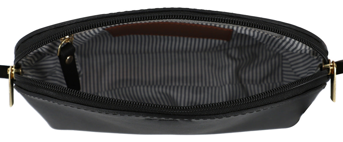 Diese stylische Handtasche aus festem und widerstandsfähigem schwarzen Rindsleder verbindet durch ihre halbrunde Form mit dem abgeflachten Boden und dem auffälligen goldfarbenen Zwei-Wege-Reißverschluss wie kaum eine andere stilistische Gegensätze miteinander und sorgt so dafür, dass „Tilda“ sich immer perfekt kombinieren lässt und zu allen Anlässen und Gelegenheiten passt. Ein zusätzlicher Pluspunkt in Sachen Sicherheit: ein in das gestreifte Innenfutter der Tasche integriertes Reißverschlussfach für Schlüssel, Smartphone oder das kleine Portemonnaie – für noch ein bisschen mehr Sicherheit und optimalen Schutz Deines Habs und Guts vor Langfingern.