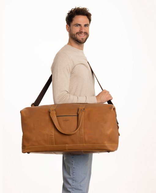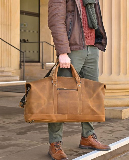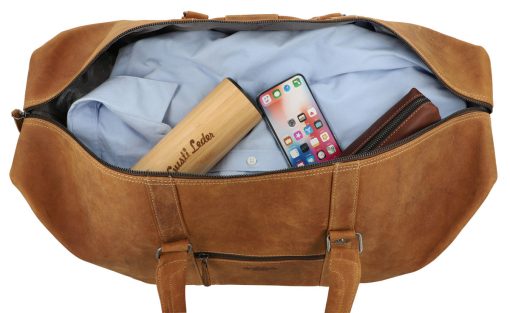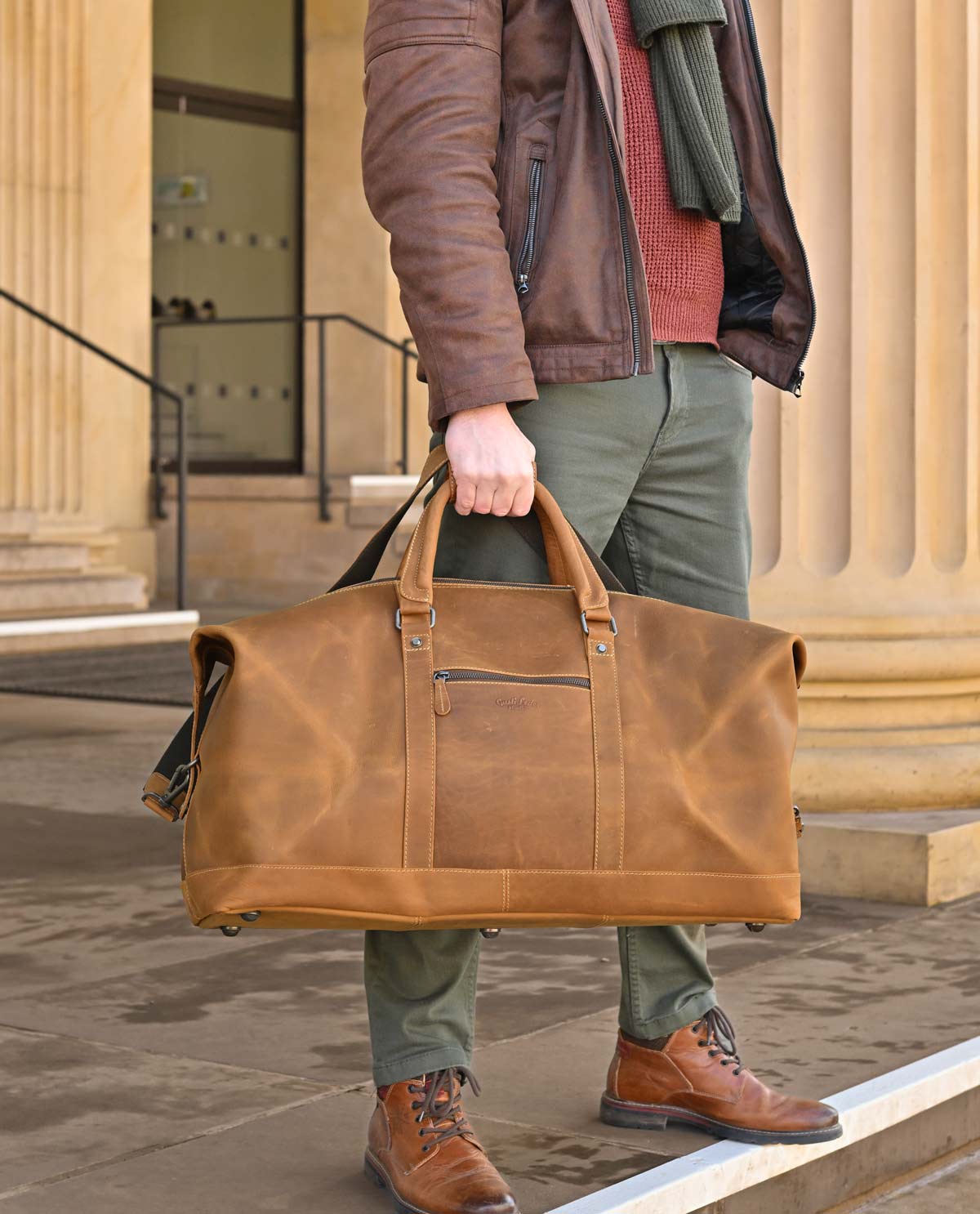 Denn diese sehr geräumige Reisetasche aus robustem Büffelleder besticht nicht nur durch ihr zeitlos-klassisches Design, sondern überzeugt obendrein mit Tragekomfort und unheimlich viel Platz. So finden ausreichend Wechselsachen und Schuhe ebenso ihren Platz wie auch Dein aktuelles Lieblingsbuch, die Waschtasche oder sogar Dein Notebook, falls Du abends dann doch noch etwas für die Arbeit erledigen musst. Auf der Vorderseite findet sich außerdem ein zusätzliches Reißverschluss-Außenfach, in dem Du Dinge wie Schlüssel, Taschentücher, eine kleine Notfall-Apotheke u.v.m. verstauen kannst.