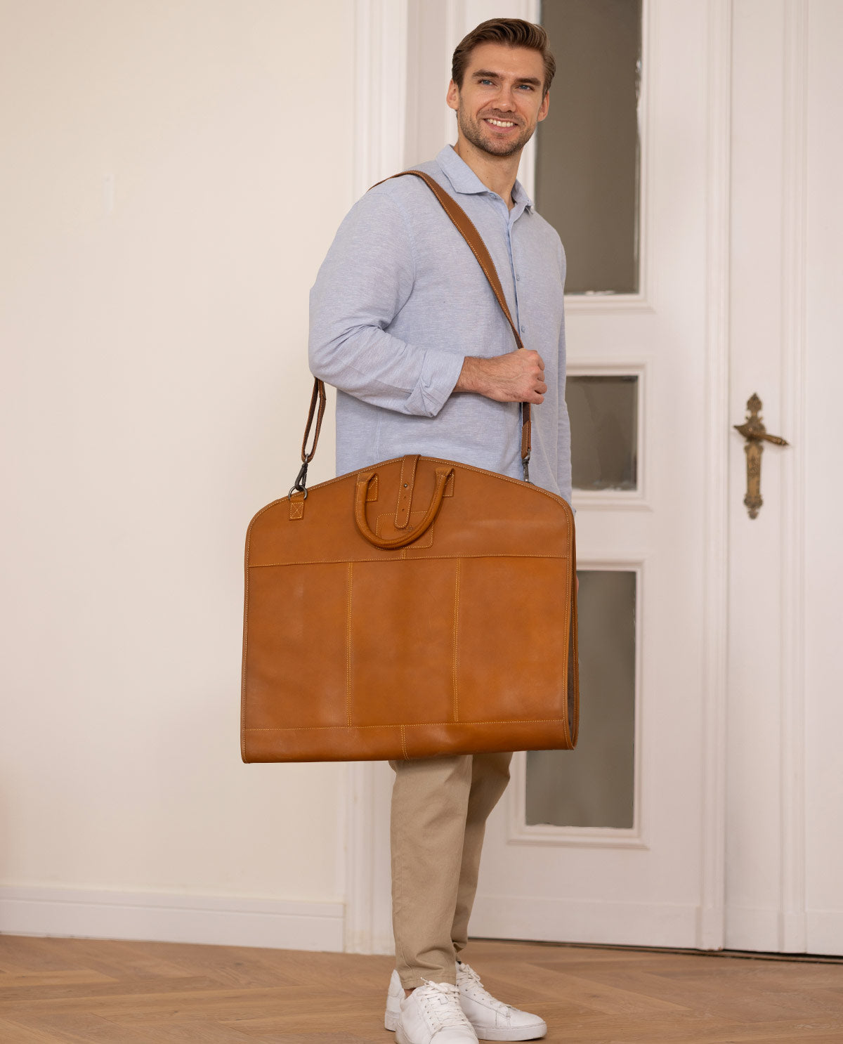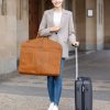 Mit unserer schönen Ledertasche „Sloan“ im Vintagestyle macht Reisen richtig Spaß. Leichtfüßig und handlich ist sie ideal als Flugbegleiter. Tragekomfort und gute Verstauungsmöglichkeiten machen dieses Lederprodukt zum vielseitigen Allrounder. „Sloan“ bietet Platz für mehrere Anzüge oder andere Kleidungsstücke, die Du einfach auf dem Kleiderbügel hängen lassen und in die Tasche einhängen kannst. Deine Schuhe finden in zwei separaten Fächern einen sicheren Platz. Fix zusammenfaltbar lässt sich „Sloan“ kinderleicht transportieren. Im klassischen Retrodesign wird dieses charmante Reiseaccessoire zum stylischen Hingucker. Inspiriert durch den urbanen Berliner Großstadt Flair verbindet „Sloan“ Funktionalität mit zeitlosem Stil.