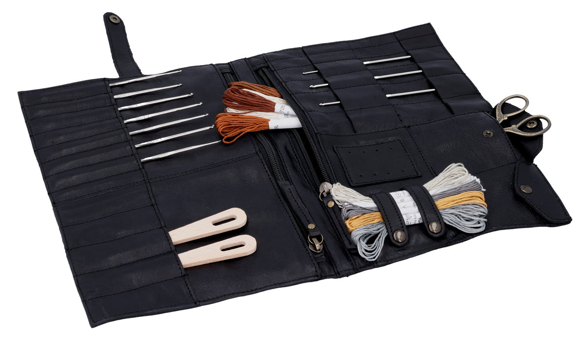 Mit der „Wilbur“ Strick- und Häkel-Werkzeugtasche aus edlem schwarzem Leder hast Du Deine wichtigsten Utensilien für Strick- und Häkelprojekte immer griffbereit. Diese elegante und praktische Tasche überzeugt durch ihre hochwertige Verarbeitung und ist der ideale Begleiter für alle Handarbeitsliebhaber.