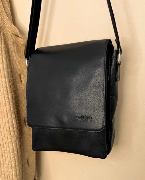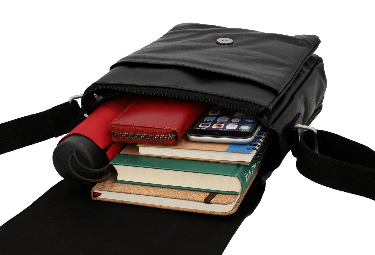 Du liebst Ordnung und Organisation? Dann ist unsere Umhängetasche „Markus“ genau die Richtige für Dich. Im geräumigen Hauptfach findest Du Platz für Notizbücher, Geldbörse und sogar eine Trinkflasche. Doch das ist noch nicht alles: „Markus“ verfügt über mehrere praktische Fächer. Hinter dem Hauptfach gibt es weiteren Stauraum und eine kleine, mit Reißverschluss gesicherte Extratasche – perfekt, um Dein Smartphone griffbereit zu haben. Auf der Vorderseite befindet sich ein weiteres Fach, und auf der Rückseite ein kleines Reißverschlussfach für Deinen Schlüssel. Deine Kugelschreiber finden im Stiftefach einen sicheren Platz. Geschlossen wird „Markus“ mit einem Magneten. Das robuste schwarze Ziegenleder ist langlebig und liegt dennoch angenehm weich in der Hand. Der längenverstellbare Trageriemen passt sich perfekt Deiner Körpergröße an. Die elegante Gusti Leder Prägung auf der Vorderseite rundet das stylische Design ab. Inspiriert durch den urbanen Berliner Großstadt Flair bist Du mit „Markus“ immer gut organisiert und stilvoll unterwegs.