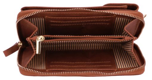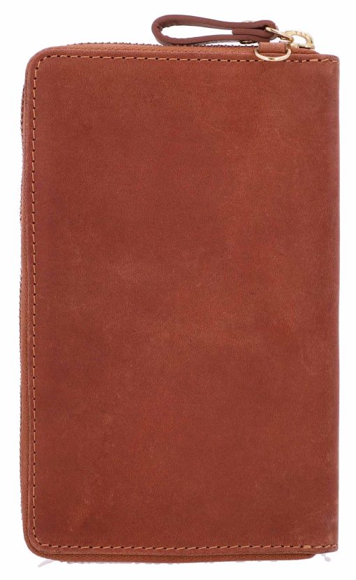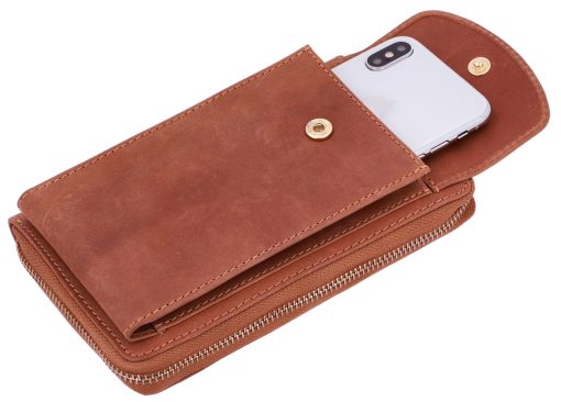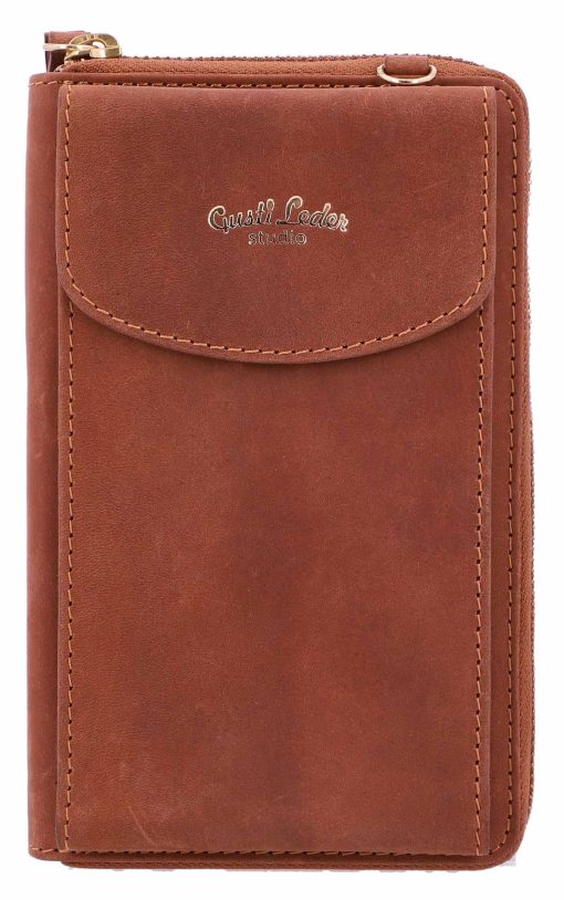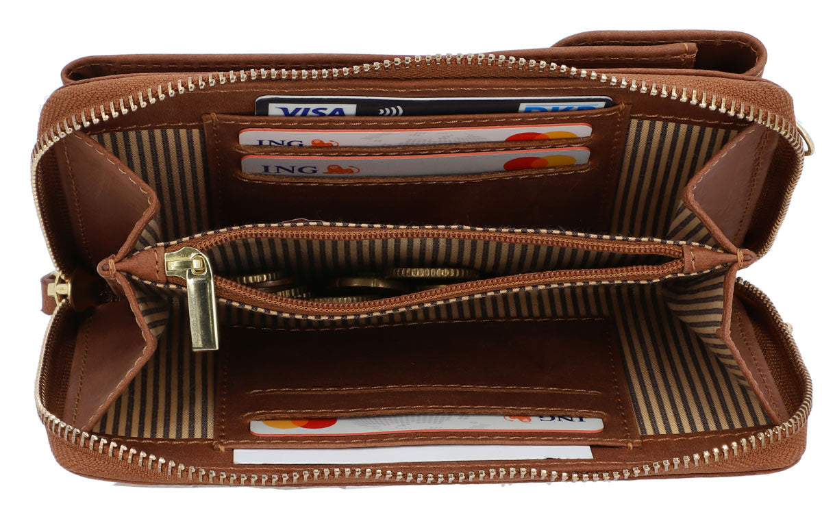 „Silvia“ ist nicht nur hübsch anzusehen sondern auch noch überaus robust und widerstandfähig – hochwertig verarbeitetem Rindsleder sei Dank. Die Handytasche lässt sich mittels Druckknopf abschließen, die Brieftache mittels Reißverschluss. Im Inneren hast du genug Platz für diverse Karten und Geldscheine und sogar Münzfach in der Mitte. Abgerundet wird das Design von „Silvia“ durch ihre schmalen Trageriemchen. So kannst sie bequem umhängen und dich ins Getümmel stürzen.